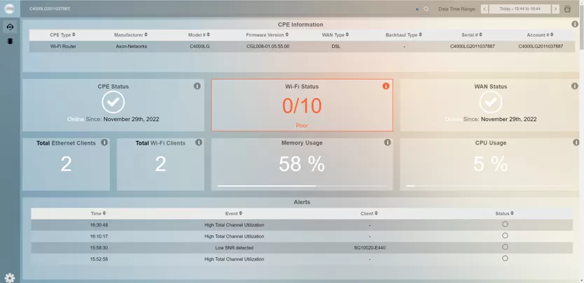 - Les utilisateurs appellent parfois le support lorsque leur signal WiFi est faible. Le module d'Alertes informera l'opérateur d'un problème et suggérera des correctifs avant que cela ne se produise.