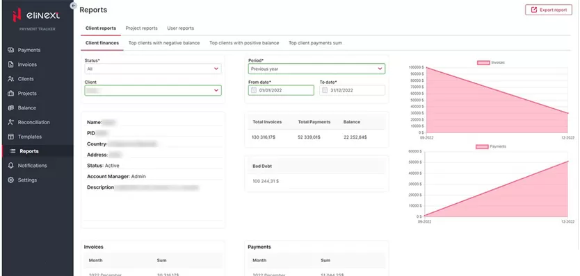 Il s'agit d'un projet interne pour notre entreprise Elinext, une société de développement de logiciels sur mesure. Elinext est sur le marché depuis plus de deux décennies et a collaboré avec des centaines de clients. Cette application web vise à fournir un suivi efficace et à aider à l'évaluation des projets de l'entreprise.