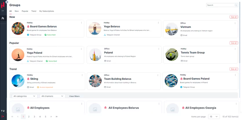 - Les utilisateurs peuvent explorer en détail une liste des groupes disponibles, suivre leur nouveauté, popularité et tendances ;